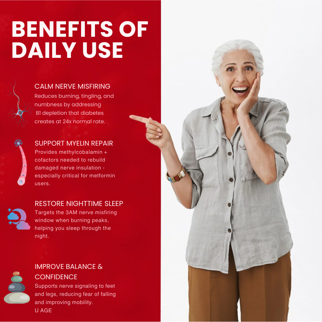 This formula uses clinically studied B-vitamins that target the specific nutrient drains diabetes creates—supporting nerve structure, addressing nutrient depletion, and promoting long-term nerve health.
