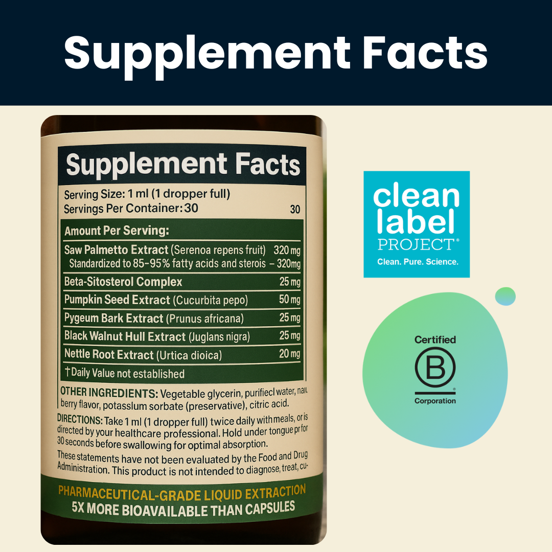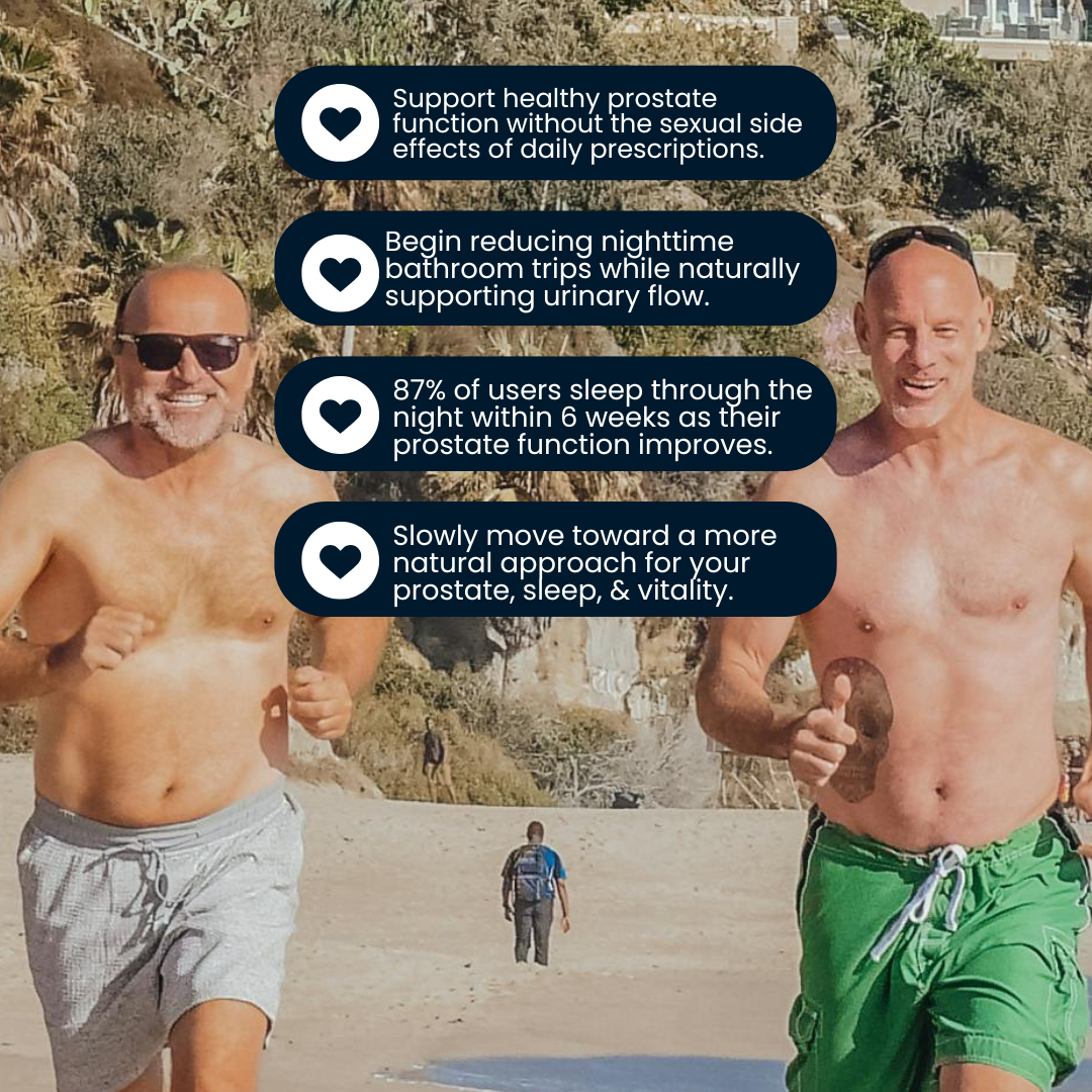 It helps support healthy prostate function using ingredients like saw palmetto, beta-sitosterol, and pumpkin seed — gently working with your body to reduce nighttime trips, support strong flow, and maintain long-term prostate health.